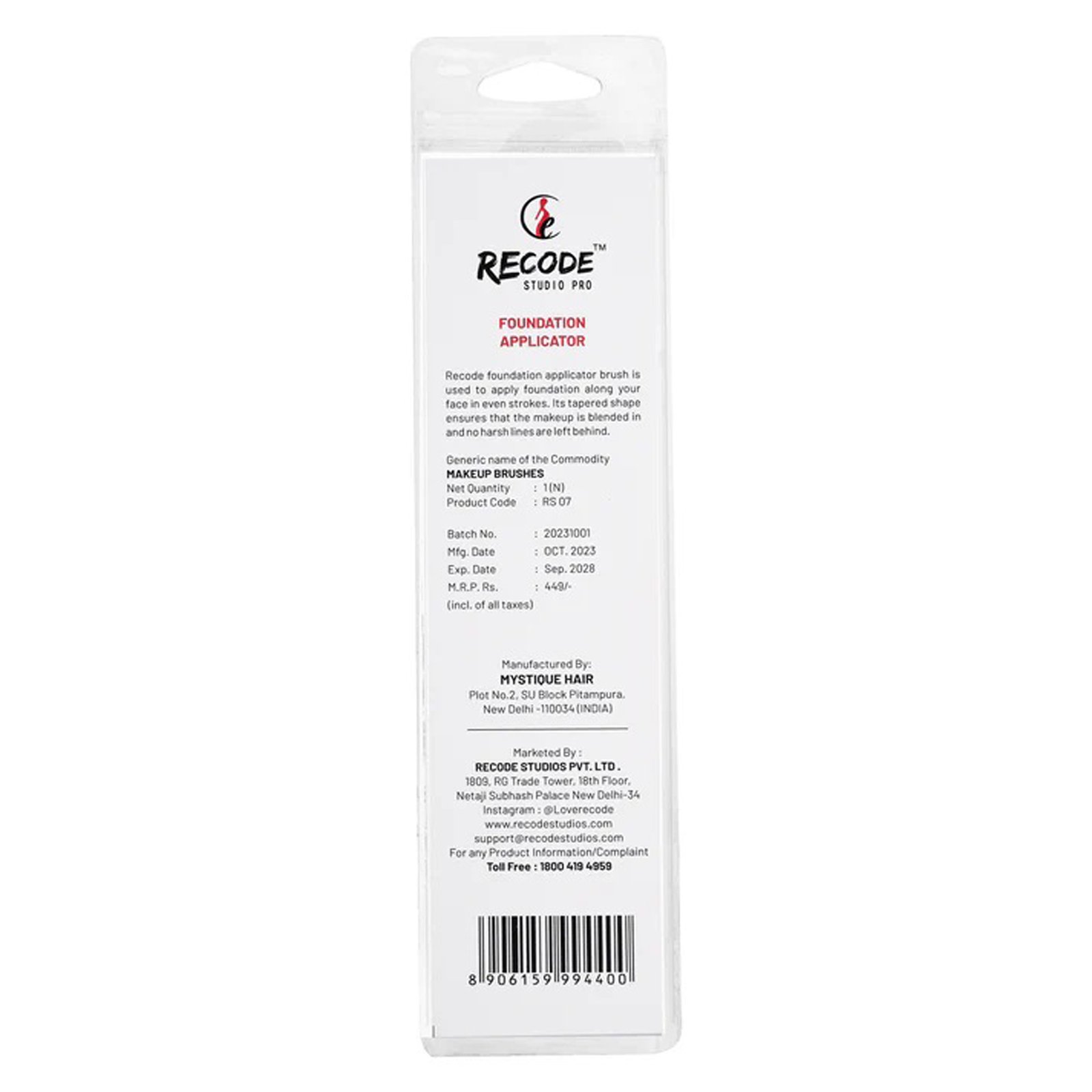 Recode foundation applicator brush is used to apply foundation along your face in even strokes. Its tapered shape ensures that the makeup is blended in and no harsh lines are left behind.