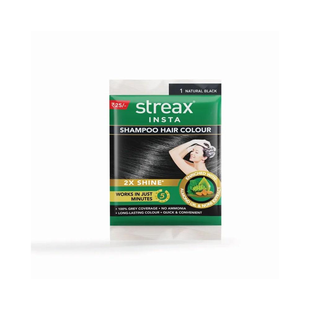 Get natural looking hair colour with ease using Streax Insta Shampoo Hair Colour. Enriched with almond oil and noni extracts, it is absolutely safe to use and is super quick and convenient. This instant hair colour is free from ammonia and provides 100% grey coverage.Features: